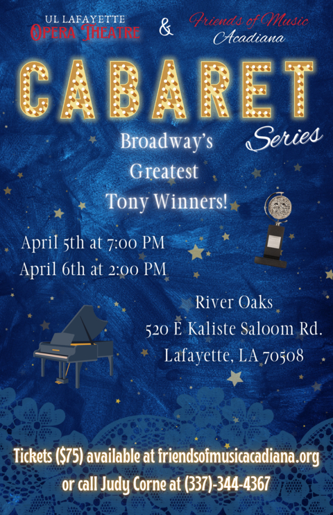 formances - Saturday evening, April 5, 2025, doors open at 7:00 pm, and Sunday afternoon, April 6, 2025, doors open at 2:00 pm. Tickets are $75.00 per person, and include a complimentary champagne pour, Irish Coffee Bar, dessert and more! Shop our Silent Auction for unique items. Tickets are available at www.friendsofmusicacadiana.org or call Judy Corne 337-344-4367. Don't miss this spectacular evening celebrating Broadway's best! Come to the Cabaret!